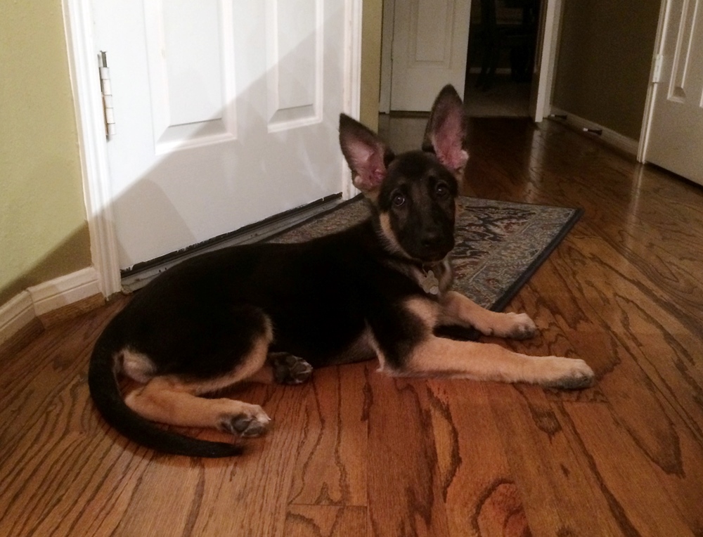 After years of tormenting from the kids (and sometimes me), Jacqui finally relented and let us get another dog. I also have to thank Bradford and Julie for having such a great German Shepherd - that dog helped tip the scale of Jacqui's decision. Anyway, the summer of 2014 was coming to and end, and if we were going to get a dog I wanted to do it before the kids went back to school. So we did some research, looked around and finally found a good Shepherd at a decent price....in Waco. Actually, it was a fun drive - me and the kids. The breeder was very nice and his facilities were as well. The puppy we got was SO CUTE, and not too much of a spaz - which is a good thing. She was born June 10, 2014, and was just under eight weeks old when we got her. Poor dog, she pooped in her crate not even two blocks from the breeder. I thought - OMG...it's going to be a looooong drive home. But it really wasn't that bad. After some time at her new home, she started to settle in.