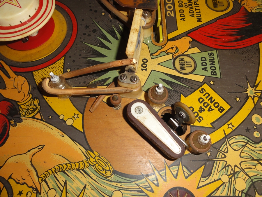 After playing many games, there was one last problem that needed to be fixed. The four bak drop targets in the middle of the playfield didn't work 100%. Sometimes they would score, and sometimes not. Sometimes the bank would reset if all four dropped, but most of the time it would not. Sounds like bad switches, right? I thought so too, until I cleaned them and tested 'em - and still had the same problem.