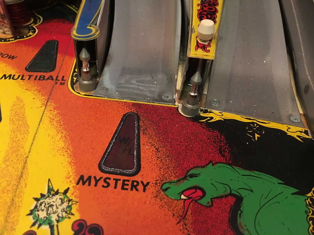 I clearly remember playing Black Knight back in the early 80's, and since I've been collecting it's always been on my 'wish list'. It was the first multi-level game, a classic Steve Ritchie design with four flippers, four sets of drop targets, and the super cool Magna-Saves. Best of all, it's FUN~! When I saw one come up for sale locally, I jumped at the chance. I found out a couple friends had already looked at the game - so I got their feedback before buying. Bottom line, it was in pretty decent shape. It had just been gone over by a reputable tech, and was running on original boards. Since I knew I'd be keeping it, I wanted to give it the complete tear down, clean up, and restoration of the playfield.