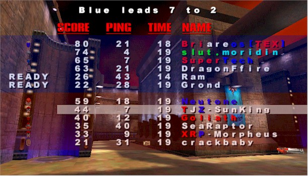 The first Tournament was the 5on5 Team DeathMatch. I was on a team with Essobie, subbie, Moridin and Grim Reaper. I felt like we had the best team - and a real good shot at a gold medal. The first match we played was a blowout - we won 150ish to 90 something. The second match was a little closer, and if I remember correctly, we pulled off a 'come from behind' victory. The 3rd match was also close - but again we were victorious and that put us in the finals. Being undefeated, we only had to win one out of two games to win the gold medal. Well, our team did loose both games in the finals - and had to settle for 2nd place in the team DM tourney. I was not at all happy with how I played - as you can see from the screenshots below.